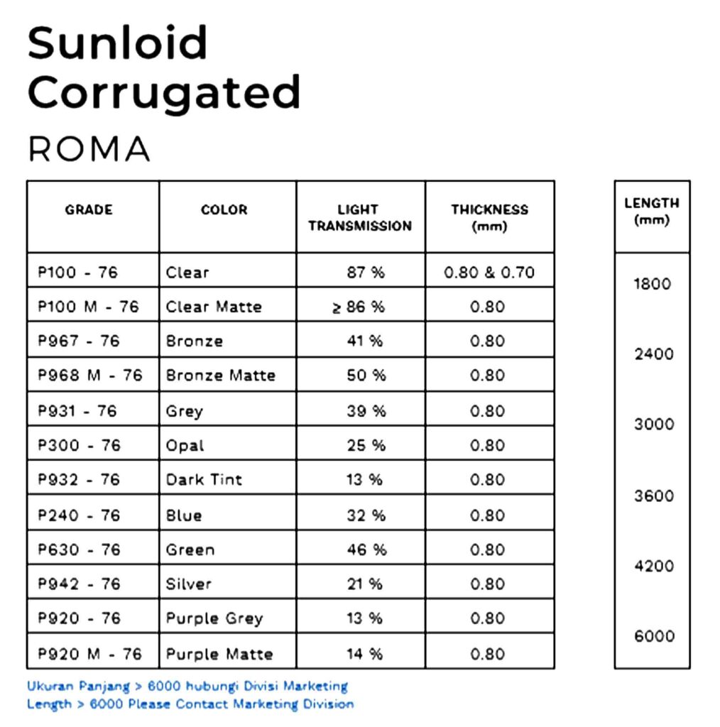 Tabel Spesifikasi Atap Sunloid Corrugated (Gelombang) ROMA
