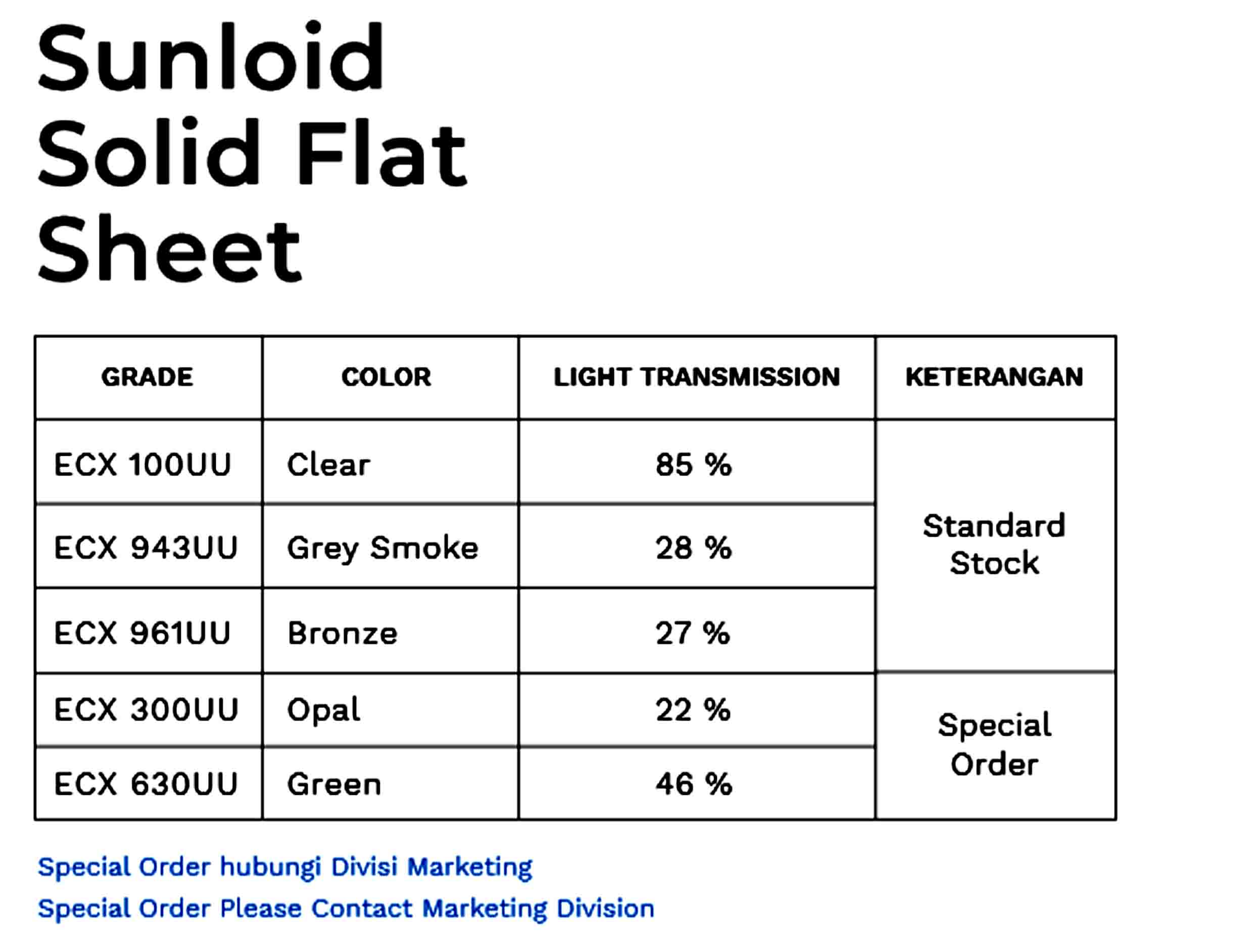 - Sunloid Solid Flat Sheet (Lembar Datar / Solid): Memiliki tampilan bening seperti kaca dengan berat beban yang lebih ringan. Akan tetapi mempunyai daya tahan kekuatan 250 kali lipat lebih kuat. Jenis ini sangat cocok digunakan untuk pembatas balkon atau atap skylight atau atap penerangan rumah.